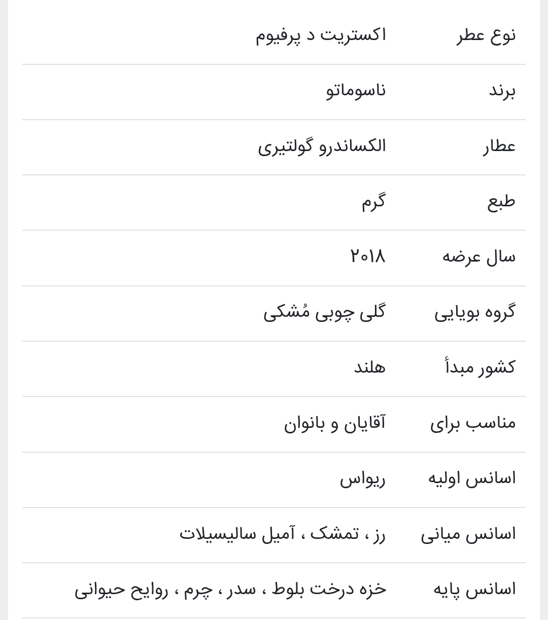 جلوههای طبیعی، هوسانگیز و بدوی این عطر ناب که پیوندی ناب میان گلها و خزها است، برخورد ظریف میان پوستهای عریان را به یاد میآورد. ناسوماتو نودیفلوروم ــ آیینی که ما را تشویق میکند تا خویشتن راستین خودمان را آشکار کنیم.