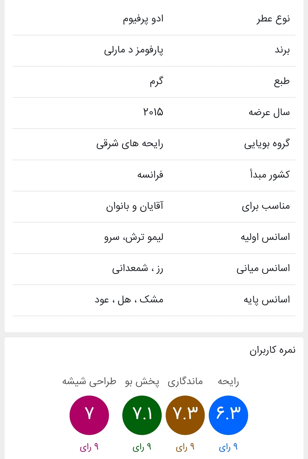عطری متمایز با کاریزماتیک شرقی که ساختارش از گل محمدی و رز بلغاری است ، که توسط دسته ای از نت های چوبی ، نعناع هندی و عود تقویت می شوند . رایحه ای عجیب و غریب از نت های بادام سوخته که احساسات را فاش میکند.