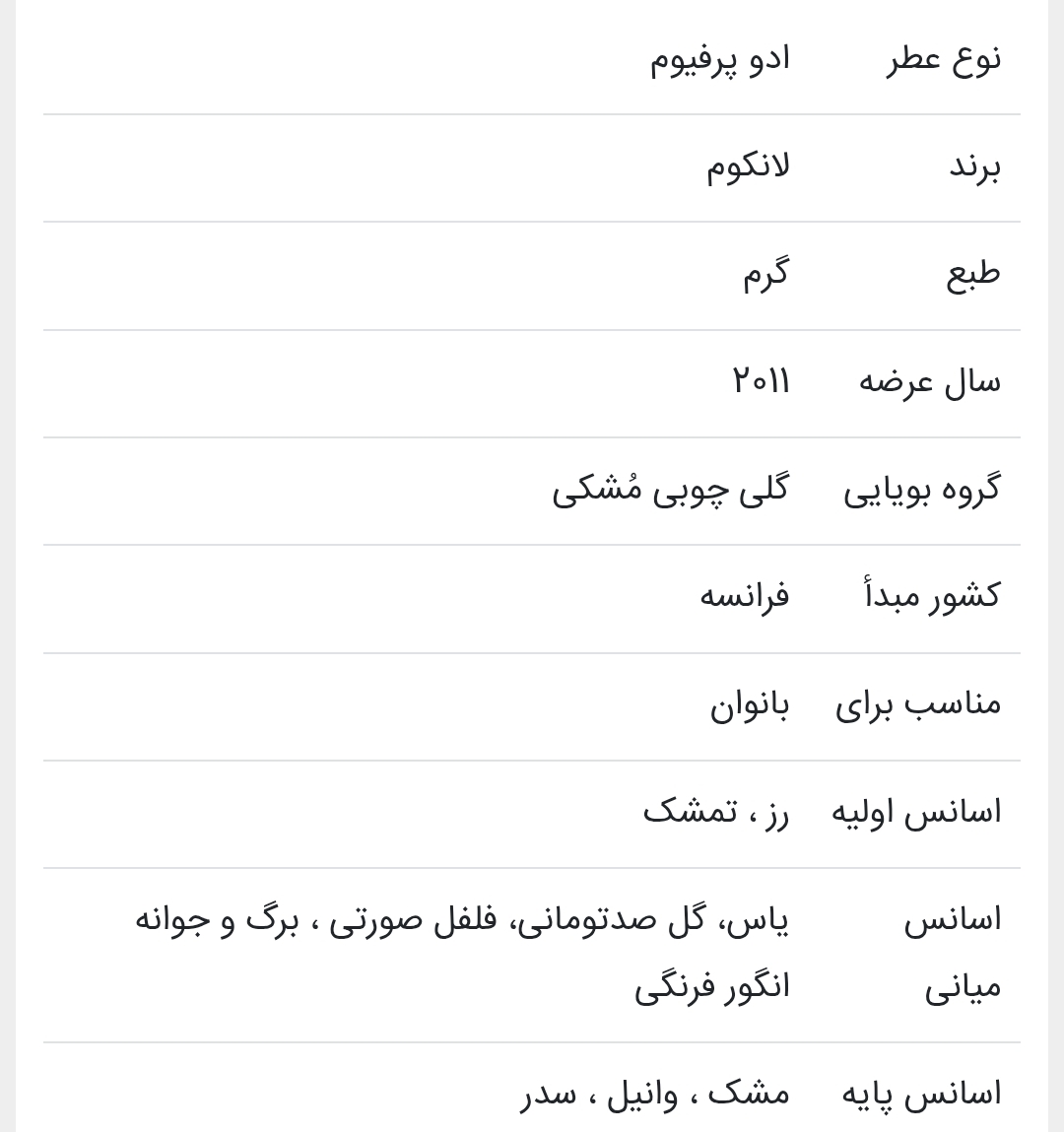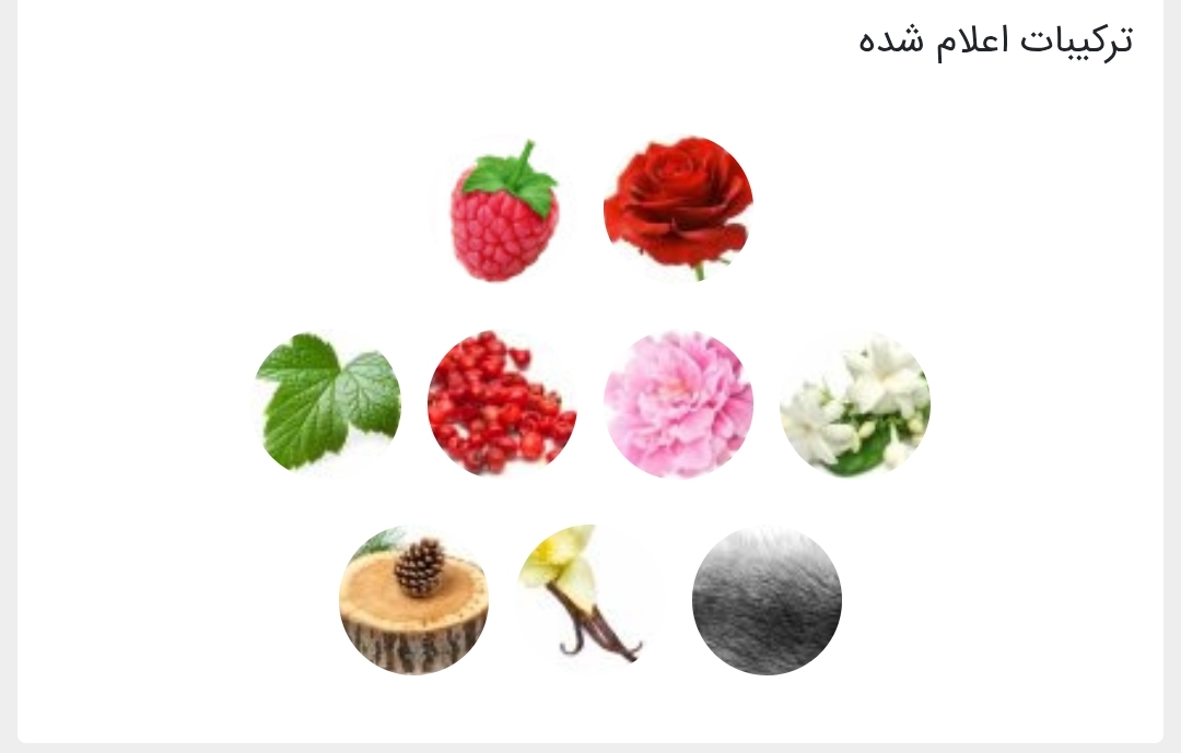 این ادکلن که از رایحهای گرم برخوردار است با بوی برجستهای از دو ترکیب رز و تمشک در نت اولیه آغاز میشود. در ادامه و در نت میانی انگور فرنگی سیاه و فلفل صورتی و در پشت آنها گلهای یاس و گل صدتومانی بنفش نمایان میشوند. سپس در نت پایانی وانیل، سدر و مشک این عطر را به پایان میبرند.