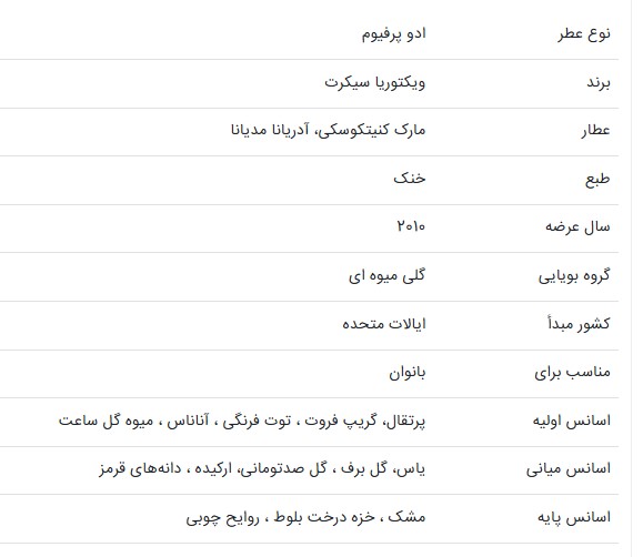 محصولی شیک و جذاب که در سال 2010 میلادی عرضه شده است. این عطر توسط برندی مطرح به نام ویکتوریا سیکرت به بازار عرضه شد و رایحه آن خنک می باشد . عطار آن مارک کنیتکوسکی، آدریانا مدیانا می باشد و در دسته عطر های گلی میوه ای قرار می گیرد. از اسانس های بکار برده شده در این عطر می توان به پرتقال، گریپ فروت ، توت فرنگی ، آناناس ، میوه گل ساعت ، یاس، گل برف ، گل صدتومانی، ارکیده ، دانههای قرمز ، مشک ، خزه درخت بلوط ، روایح چوبی اشاره کرد.